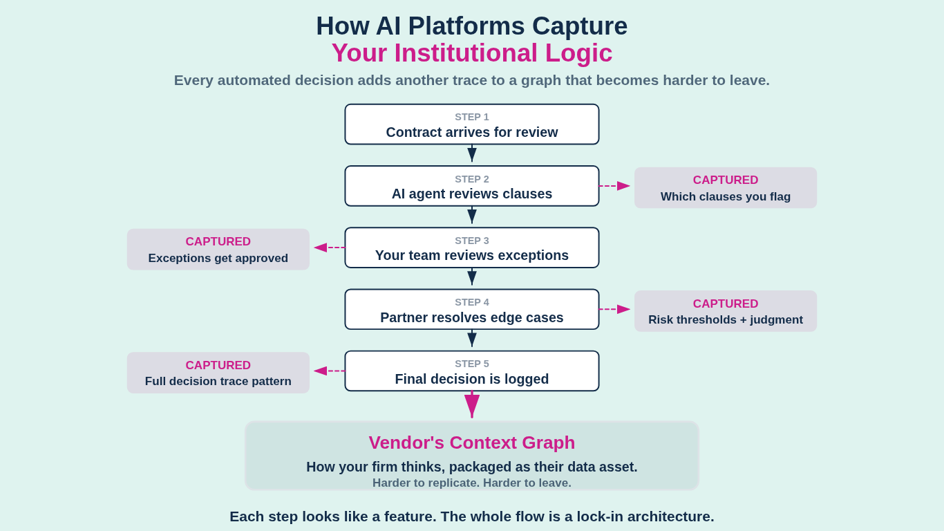 When an agent handles contract review, it doesn't just process the document. It captures which clauses your team flags, what exceptions get approved, which risk thresholds trigger escalation, and how partners resolve edge cases. That reasoning, the institutional logic connecting data to action, was never treated as data before. Now it is. And whoever's platform captures it owns something far more valuable than your files.
