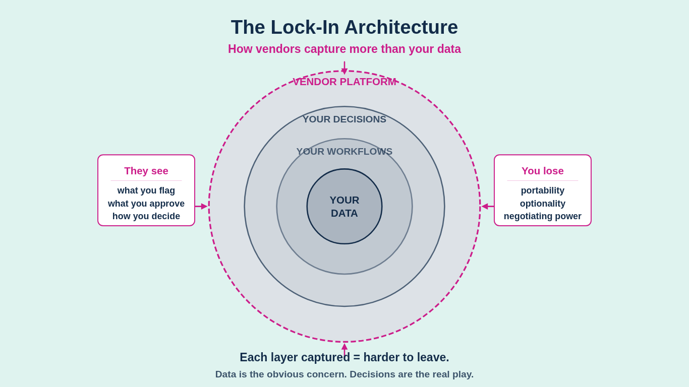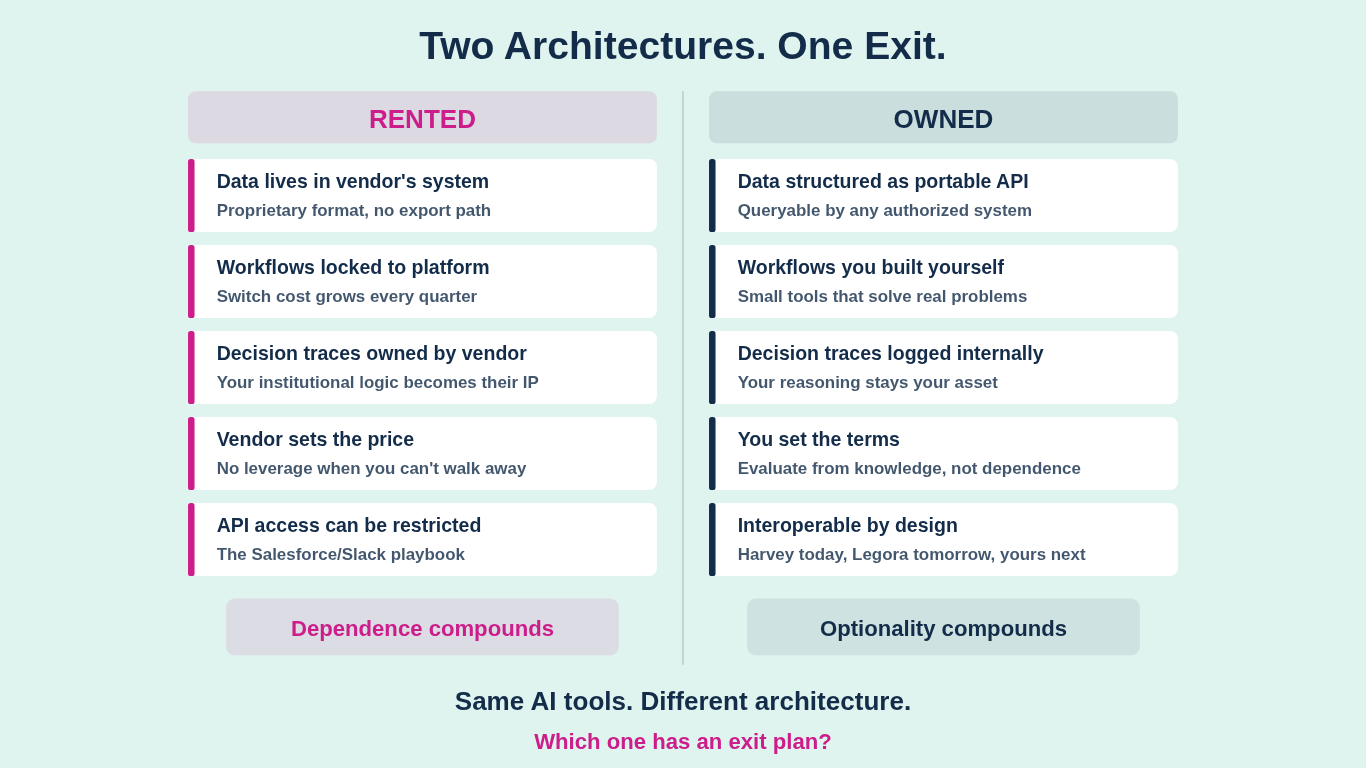 The structural issue isn't contract language. It's architectural. If your workflows, your decision patterns, and your institutional knowledge all live inside a vendor's system, your contract terms are a guardrail on a road you don't own.