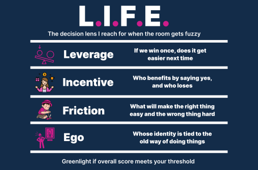 That was the moment I admitted what I already knew. Good ideas often lose for boring reasons. I started naming those reasons out loud, Leverage, Incentive, Friction, Ego, and I used them like a flashlight instead of a fog machine. I call it L.I.F.E., and it is how I decide what to build, what to buy, and whether AI is actually ready for a legal setting that owns real risk, not just a demo reel.